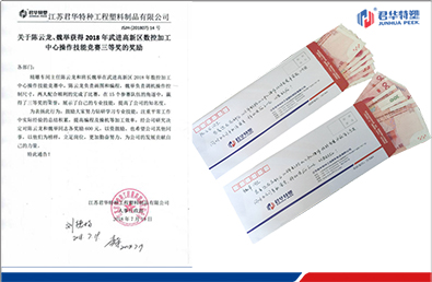 我司加工車(chē)間主任陳云龍和班長(zhǎng)魏舉果然不負(fù)眾望,榮獲三等獎(jiǎng),并由常州機(jī)電職業(yè)技術(shù)學(xué)院的馬院長(zhǎng)親自頒發(fā)證書(shū)。同時(shí)也為江蘇超聚/江蘇君華特種工程塑料制品有限公司贏得了這份榮譽(yù)。